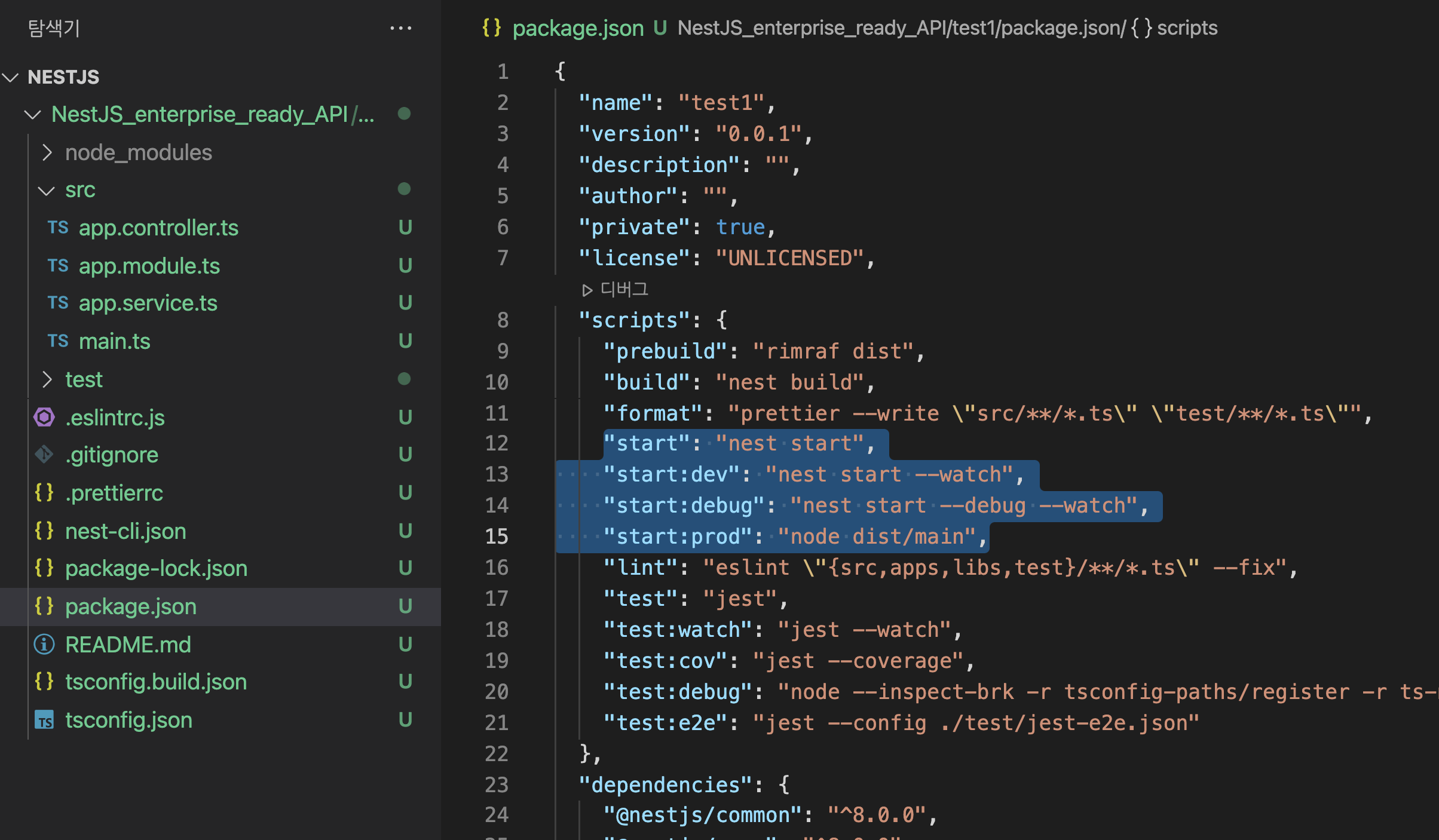 - pakage.json의 script를 살펴보자. 우리는 실행시 아래 명령문으로 실행 할 예정이다.