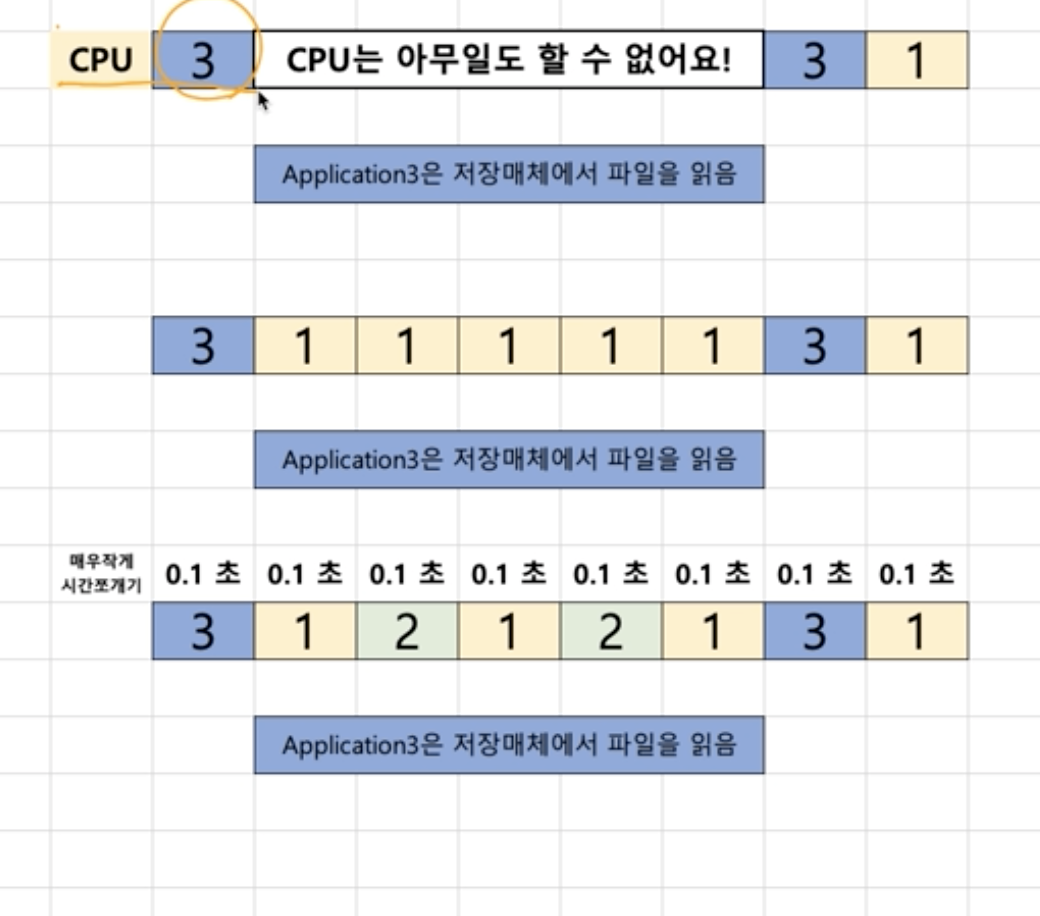 - 응용 프로그램은 온전히 CPU를 쓰기 보다, 다른 작업을 중간에 필요로하는 경우가 많습니다.