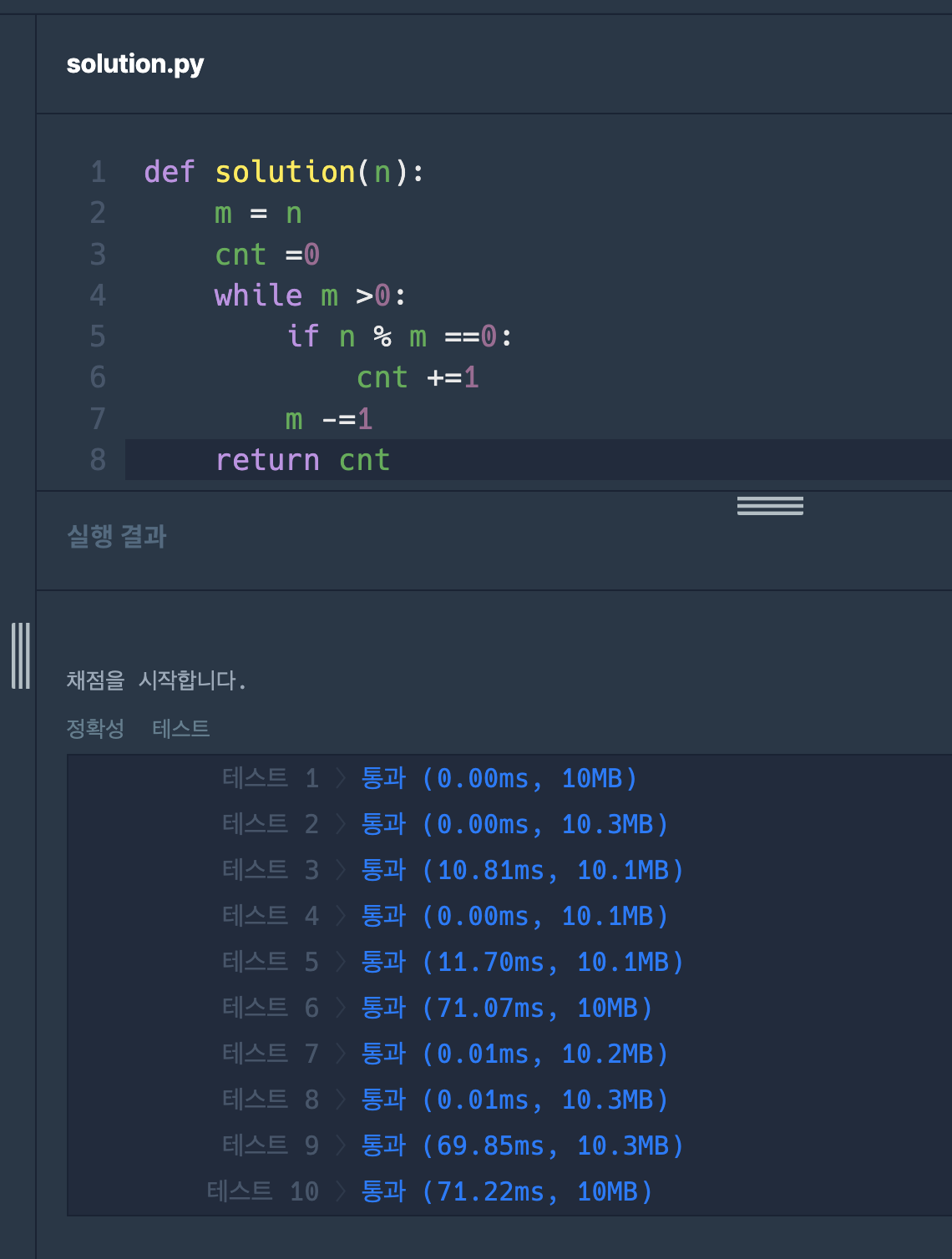 - n이 100 이므로 곱이 100인 순서쌍은 (1, 100), (2, 50), (4, 25), (5, 20), (10, 10), (20, 5), (25, 4), (50, 2), (100, 1) 이므로 9를 return합니다.