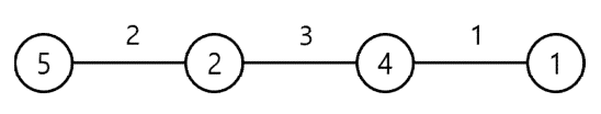 예를 들어, 이 나라에 다음 그림처럼 4개의 도시가 있다고 하자. 원 안에 있는 숫자는 그 도시에 있는 주유소의 리터당 가격이다. 도로 위에 있는 숫자는 도로의 길이를 표시한 것이다.