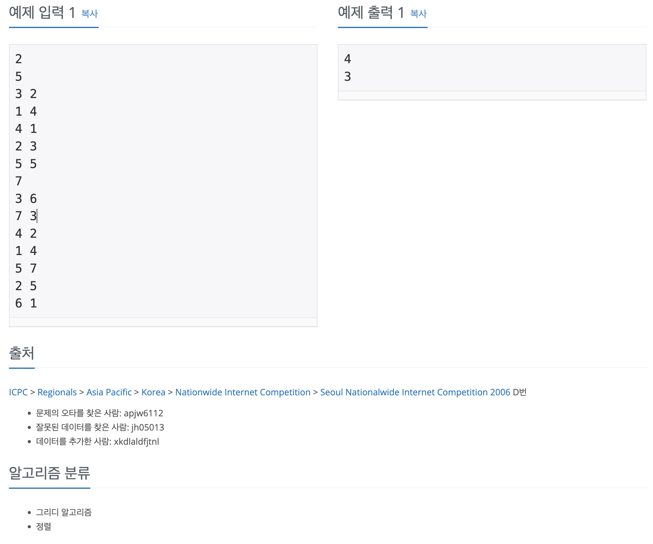 첫째 줄에는 테스트 케이스의 개수 T(1 ≤ T ≤ 20)가 주어진다. 각 테스트 케이스의 첫째 줄에 지원자의 숫자 N(1 ≤ N ≤ 100,000)이 주어진다. 둘째 줄부터 N개 줄에는 각각의 지원자의 서류심사 성적, 면접 성적의 순위가 공백을 사이에 두고 한 줄에 주어진다. 두 성적 순위는 모두 1위부터 N위까지 동석차 없이 결정된다고 가정한다.