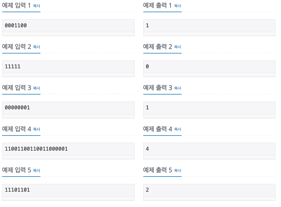 이 풀이의 포인트는 0과 1로 이루어진 블럭의 갯수 중 가장 작은 수를 구하는 것이다.
