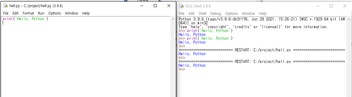 1. 코드 작성 후 py확장자로 폴더에 파일 hell.py저장