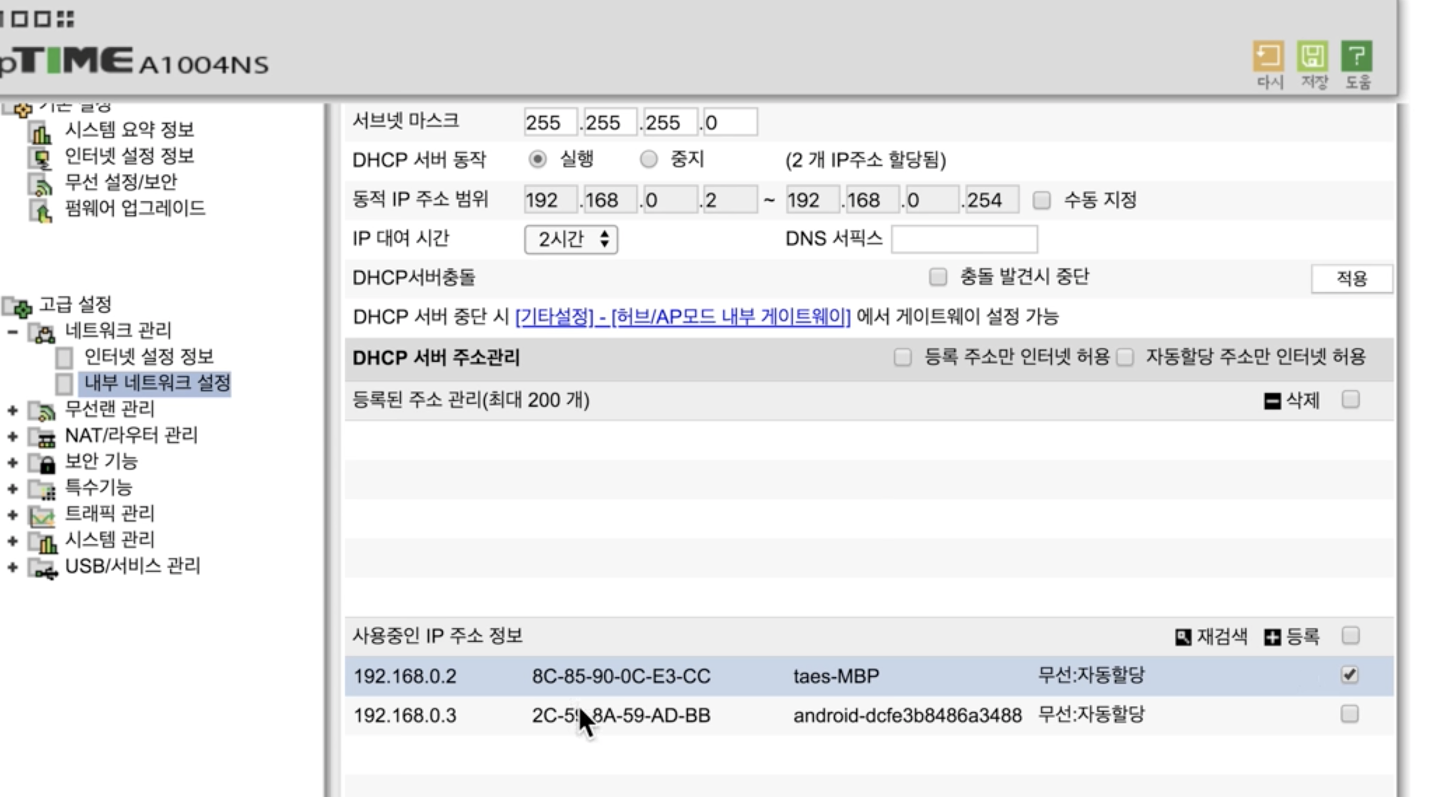 2. 고급설정 - 네트워크관리 - 내부 네트워크 설정(DHCP 서버 설정)