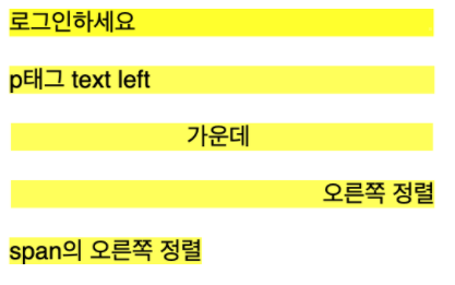 - 왼쪽 정렬 : left, 모든 요소의 기본 정렬은 왼쪽 정렬이므로, 아무 text-align을 주지 않은 태그는 왼쪽 정렬이됨.