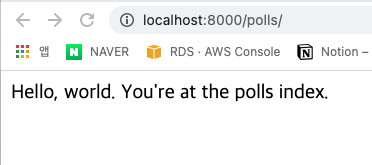 브라우저에서 http://localhost:8000/polls/를 입력하면 index 뷰에 정의한 《Hello, world. You’re at the polls index.》 가 보일 것입니다.
