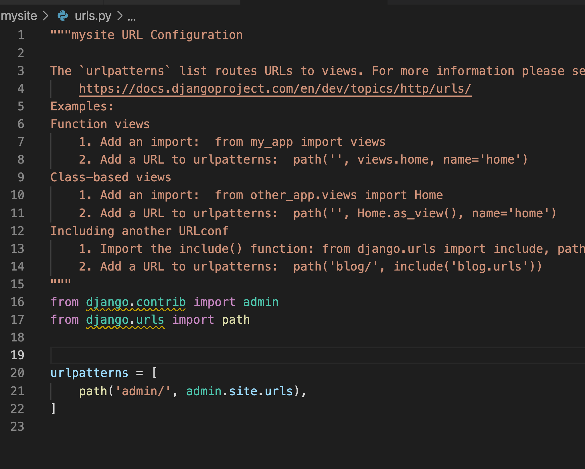 mysite/urls.py 파일을 열고, django.urls.include를 import 하고, urlpatterns 리스트에 include() 함수를 다음과 같이 추가합니다.